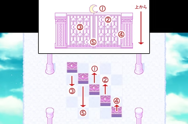 【결정에 갇힌 피그를 구하기】 '거울 조각 5장'을 입수합니다. 상자 열쇠: 광장 어딘가에 떨어져 있습니다. 목 없는 여신상: ▲▼를 나타내는 무언가가 광장 어딘가에 있습니다. 비석 위의 유리 구슬: 무언가를 사용해 떨어뜨립니다. 계단 위 기둥의 숫자 입력: 같은 색을 한 무언가가 광장 어딘가에 있습니다.