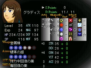 적의 공격이 아프거나 적이 단단하다고 느껴질 때는 ATK 게인, DEF 게인 등의 능력 UP 스킬을 시도해 봅시다. 수수하지만 강력하므로 잘 사용하면 전투가 편해집니다.